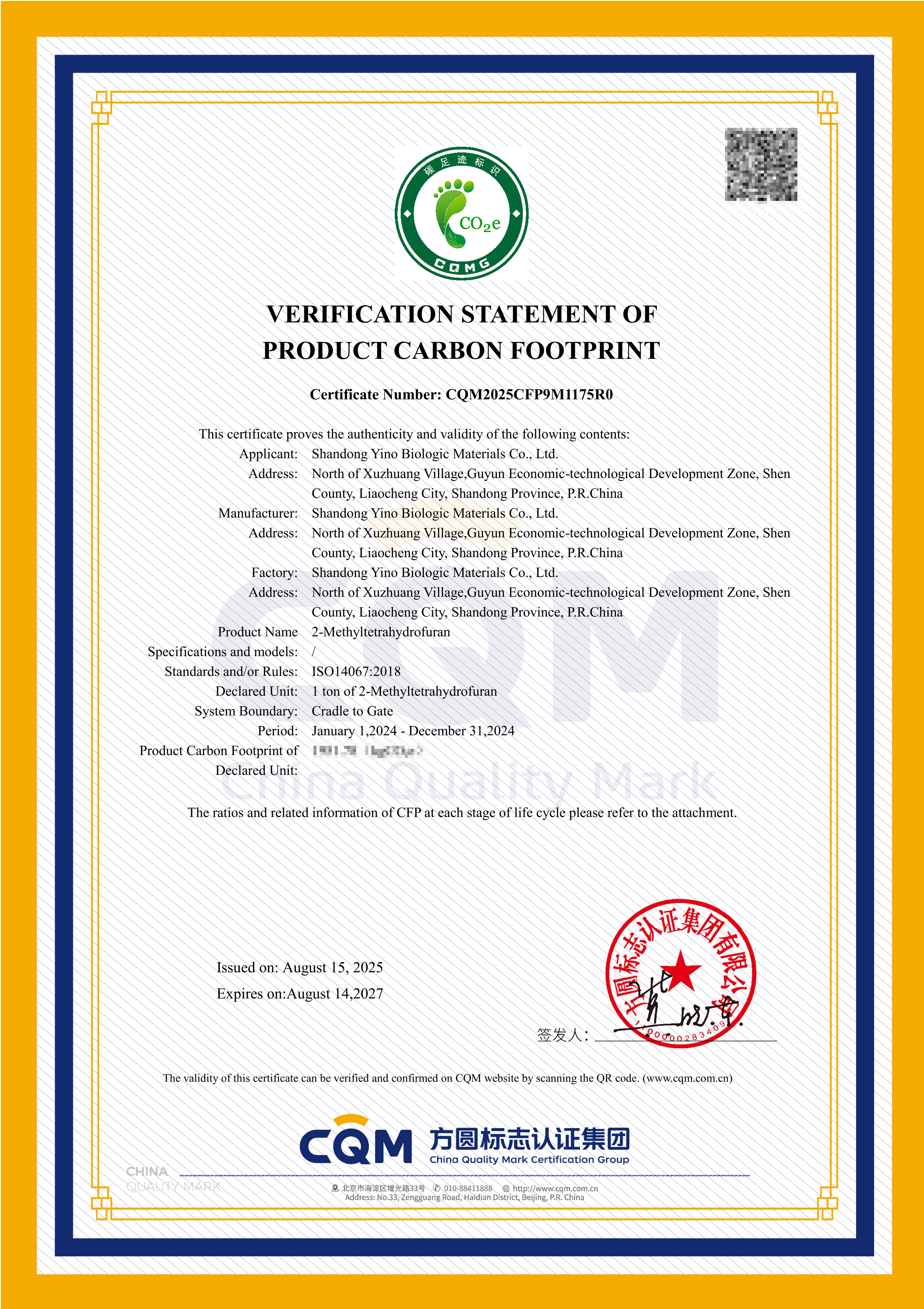 The certified product is 2-Methyltetrahydrofuran (2-MeTHF), a green, bio-based solvent produced from corncob biomass. By replacing fossil-based feedstocks, this product significantly reduces emissions at the source and provides customers with a sustainable alternative for pharmaceutical synthesis, agrochemical formulations, and polymer production. Known for its strong solvency, high chemical stability, and low environmental risk, 2-MeTHF plays an increasingly vital role in enabling sustainable transformation across the chemical and pharmaceutical industries. With the new PCF certification, YINO Biologic makes its production process transparent, measurable, and traceable, providing partners with reliable assurance of low-carbon responsibility.