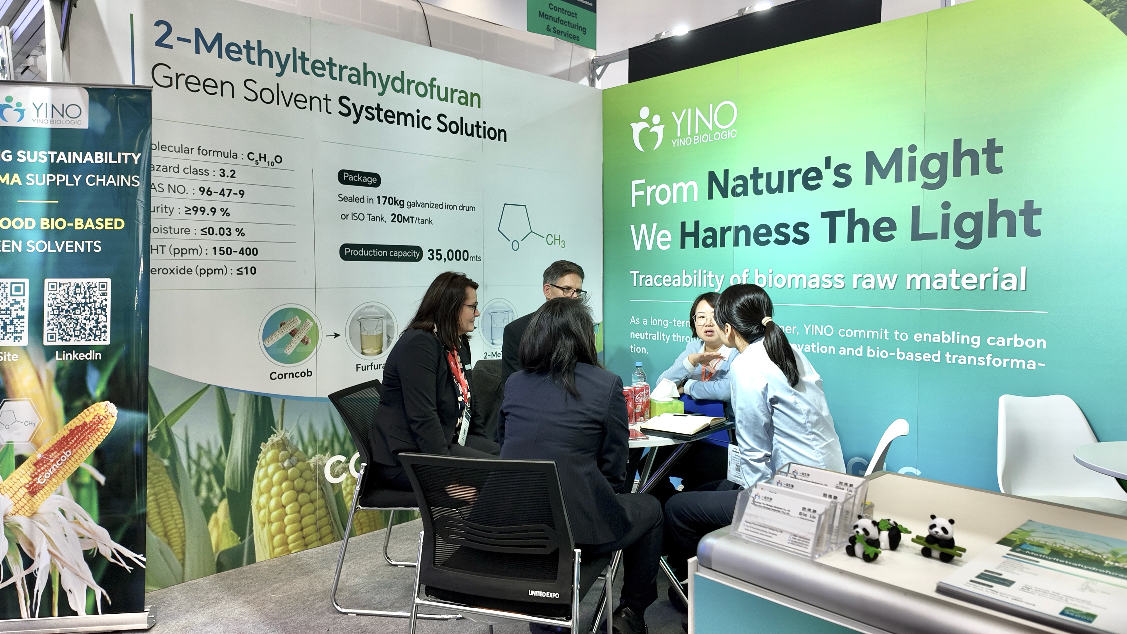 在制藥生產(chǎn)中,溶劑與原料的選擇不僅關(guān)系到工藝的安全性與環(huán)境友好性,更直接影響藥物純度和生產(chǎn)效率。YINO Biologic 以非糧生物質(zhì)玉米芯為原料,從源頭實現(xiàn)碳減排與資源高效利用,構(gòu)建了覆蓋從原料到終端制造的綠色供應(yīng)鏈。本次展會上,公司重點展示了多款高性能可持續(xù)產(chǎn)品,包括可作為活性藥物成分(API)合成綠色溶劑的 2-Methyltetrahydrofuran(2-MeTHF),該產(chǎn)品可有效替代傳統(tǒng) THF,顯著降低揮發(fā)性有機(jī)物排放并提升反應(yīng)安全性與效率;用于高端藥物保護(hù)基及精細(xì)化工中間體合成的關(guān)鍵原料 3,4-Dihydro-2H-Pyran(DHP);以及新一代高純度環(huán)狀酯原料 δ-Valerolactone(δ-VL),廣泛應(yīng)用于藥物輔料及聚合物開發(fā)領(lǐng)域,充分展現(xiàn)了 YINO 在綠色化學(xué)與可持續(xù)材料創(chuàng)新方面的實力。